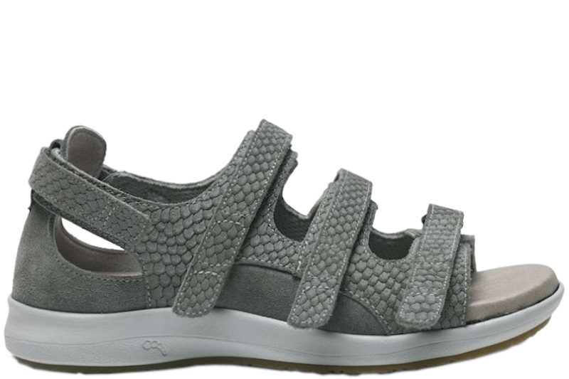 Super gode New feet sandaler i army grå kalveskind med prægning. Sandalen er med fire justerbarer velcroremme, tre over foden og en bagtil. Disse remme kan nemt klippes til, hvis man synes de er for lange. Indlægsålen er 6 mm. og har en utrolig god støtte, er stødabsorberende og bløde. Indlægsålen sidder fast med velcro. Der er ingen indvendige syninger, og modellen har en stabil hælkappe, som er velegnet til gigtramte, diabetiker og følsomme fødder. Slidsålen er en god solid gummisål, som står godt fast. God sandal med en super god støtte.