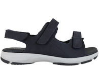 Smart sandal fra New Feet i mørkeblå nubuck. Sandalen er lavet i en flot blå farve. Modellen er med tre justerbare velcroremme. En over vristen, en over tæerne og en rundt om hælen, så den kan reguleres godt til foden. Mellem remmene er der to krydsremme, der giver et smart look til sandalen. Modellen har en super god pasform. Indlægssålen er grå, måler 6 mm. og har en utrolig god støtte. Indlægssålen er desuden stødabsorberende, blød og sidder fast med velcro. Der er ingen indvendige syninger. den er meget velegnet til gigtramte, diabetikerer og følsomme fødder. Slidsålen er en god solid sort gummisål, så man står godt fast. God sandal med en super støtte.