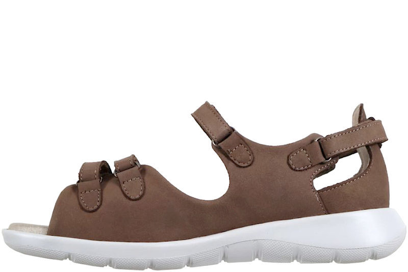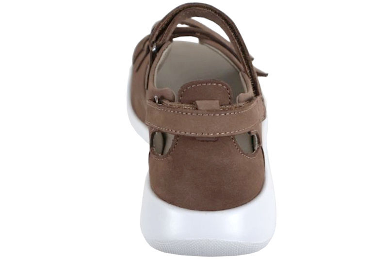 Super fin sandal fra New feet i sandfarvet Nubuck. Over forfoden har sandalen to velcro remme som gør sandalen let at komme i og af. Ligeledes har sandalen er regulererbar velcro rem ved indsteppet samt ved hælkappen. Indlægsålen er 6 mm. og har en utrolig god støtte, er stødabsorberende og blød. Indlægsålen sidder fast med velcro og er derfor udtagelig. Der er ingen indvendige syninger, og modellen har en stabil hælkappe som er velegnet til gigtramte, diabetiker og følsomme fødder. Slidsålen er en god solid gummisål, som står godt fast. God sandal med en super god støtte.