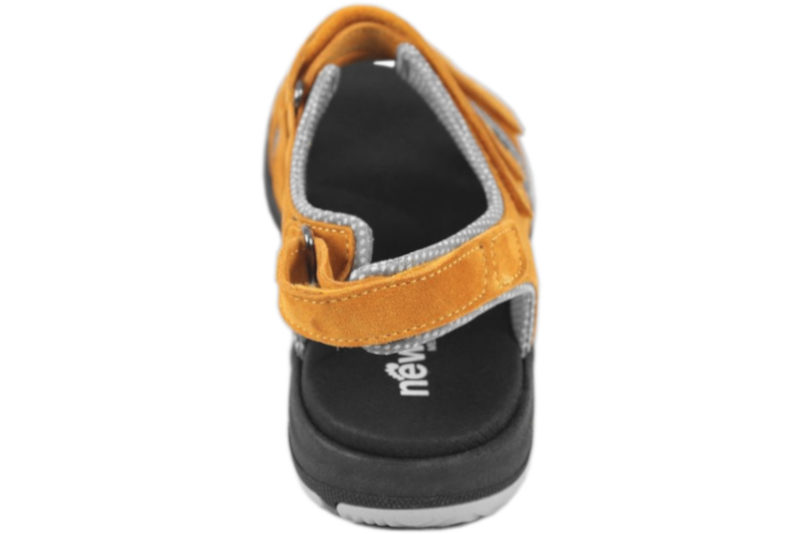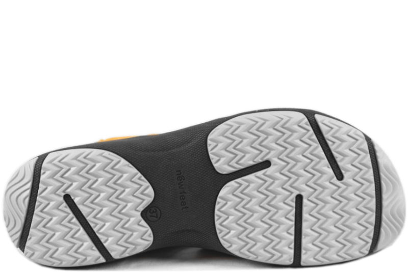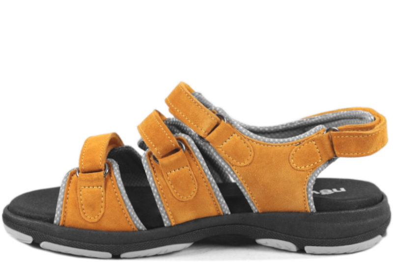 Super gode New feet sandaler i gul ruskind med lyse stikninger. Sandalen er med fire justerbare velcroremme, tre over foden og en bagtil. Disse remme kan nemt klippes til, hvis man synes de er for lange. Indlægsålen er 6 mm. og har en utrolig god støtte, er stødabsorberende og bløde. Indlægsålen sidder fast med velcro. Der er ingen indvendige syninger. Sandalen er velegnet til gigtramte, diabetiker og følsomme fødder. Slidsålen er en god solid gummisål, som står godt fast. God sandal med en super god støtte.