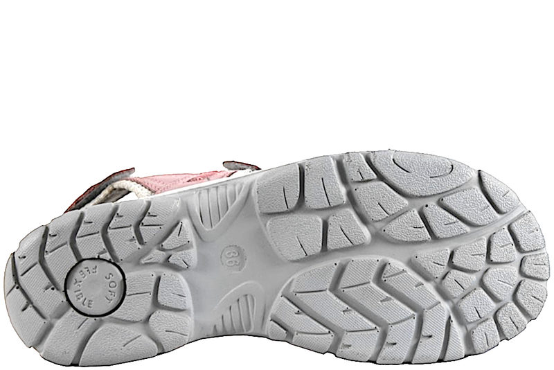 Rigtig god sandal fra Reserved til damer. Sandalen er lavet i grå tekstil og rosa nubuck med rosa stikninger. Sandalen har to remme over foden og en på hælen, hvilket gør sandalen nem at justere efter foden. Sandalen er foret med gråt tekstil. Mellemsålen er lysegrå og slidsålen grå. Rigtig god sandal i en fin feminin farve.