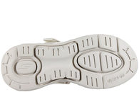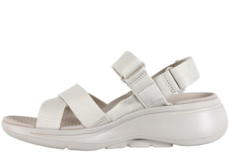 smart sandal fra Skechers. Sandalen er lavet i råhvidt tekstil. Den har to regulerbare velcroremme, en rundt ved anklen og en rundt om hælen, så den nemt kan tilpasses efter foden. Henover forfoden har den en rem der danner et kryds, som giver en smart detalje til skoen. Indvendigt er den foret med tekstil og har en dæksål i EVA-skum med svangstøtte, så den er blød at gå på og har en god støtte til foden. Mellem- og slidsål er lavet af beige EVA, så den har en blød og lækker komfort. Virkelig lækker sandal til sommer.