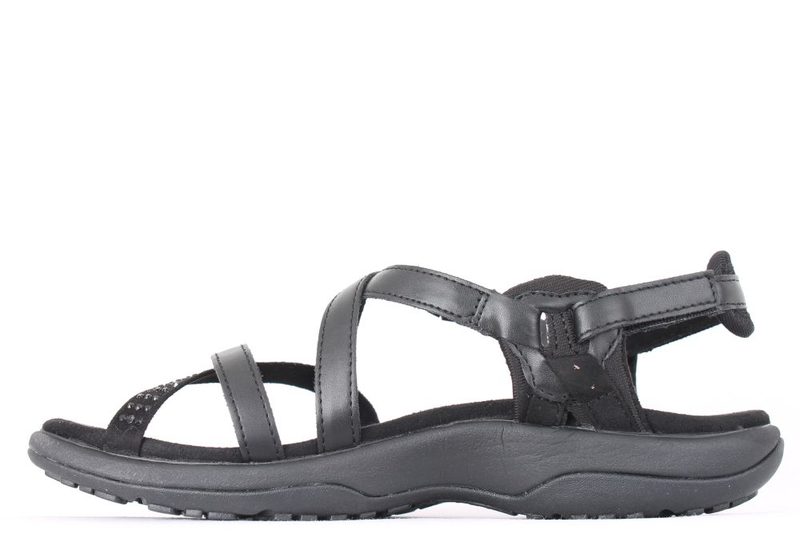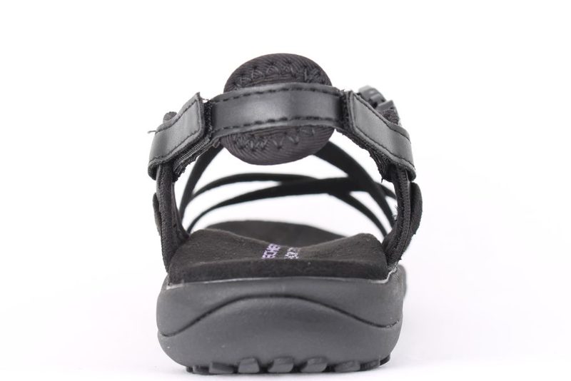SKECHERS REGGAE SLIM FESTIVITY. Sandal fra Skechers i sort. Sandalen har fire remme, som krydses hen over foden. Den ene rem ude ved forfoden er med små sorte sten. Den kan justeres ved hælen via to velcroremme og lukkes med klikspænde på ydersiden af foden. Sandalen har den kendte Memory Foam dæksål, som gør den super behagelig at have på. Super fin sandal, som kan bruges til meget.