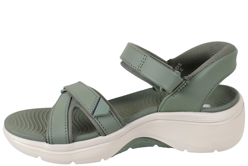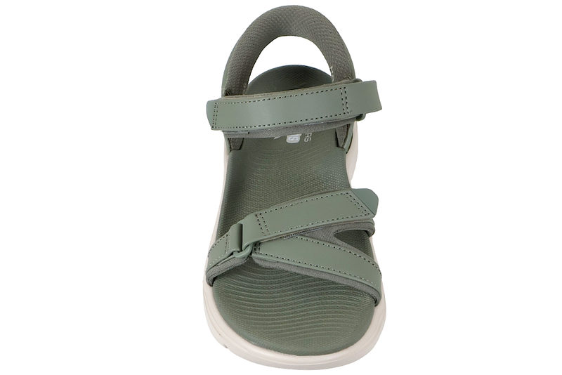 Sandal med god komfort til damer. Sandalen er lavet i olivengrønt tekstil og har to justerbare velcroremme. Den ene rem går over forfoden, en over vristen. Sandalen har svangstøtte og slidsålerne er lavet af hvidt EVA-skum, hvilket gør dem stødabsorberende og fleksible. Sandalen er med slip-ins funktion, som gør det super nemt at komme i og af sandalen. Sandalen har plateausål og hælen måler 4 cm. Under forfoden måler sandalen 2 cm. Alt i alt en super smart sandal med god pasform og komfort.