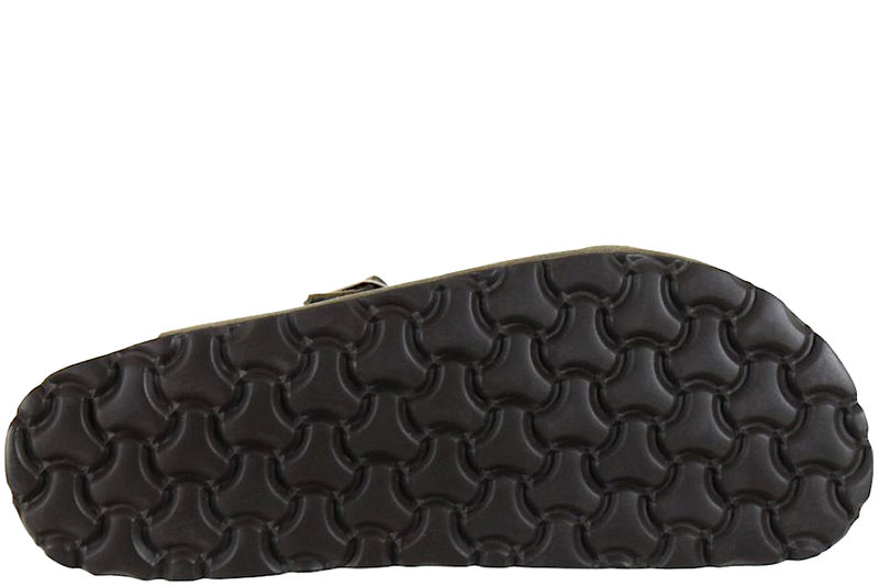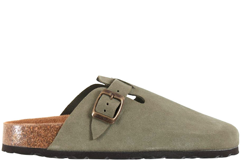Olivenfarvet slenters i skind med lukket snude. Den har en justerbar rem over vristen og en korksål, som er dejligt blød at træde på. Foden ligger i en fodseng. Slidsålen er brun. Super dejlig komfort slippers, som er perfekt til sommer og god til pænere brug eller som praktisk slippers.