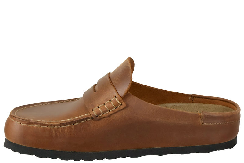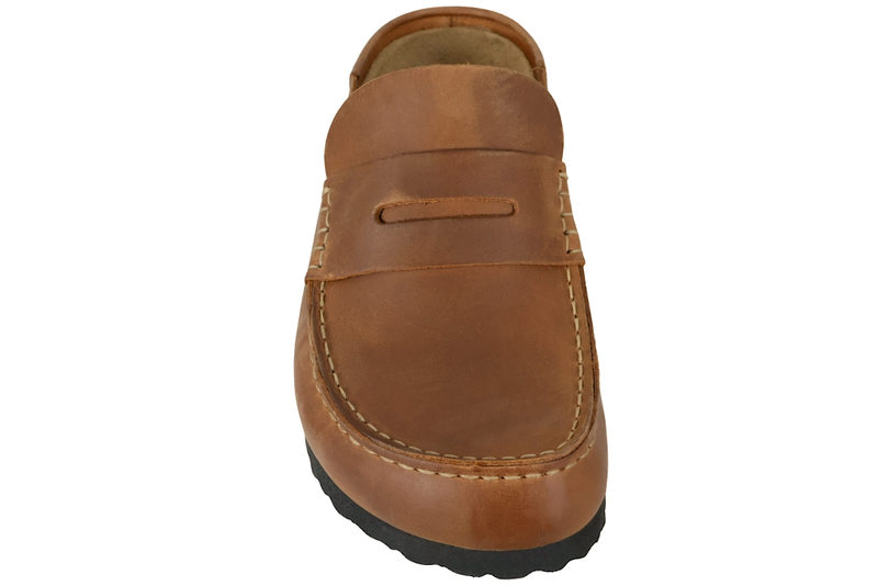 Super smart slenters til herre og damer fra Birkenstock med lukkede snude. Den er lavet af olieret skind i farven cognac. Foran er der en moccasin syning, som giver et smart look. Indvendig er den foret med skind og har den velkendte anatomiske dæksål. Slidsålen er en sort PVC sål. Dette er den smalle model.