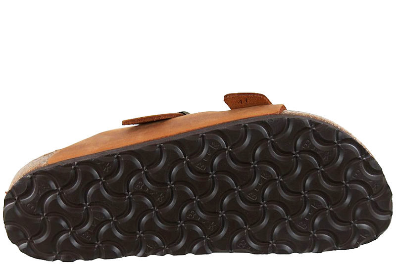 Smart slenters fra Birkenstock. Modellen hedder Arizona og har to remme henover foden. Sandalen er lavet i cognac Birko-Flor og imiteret nubuck, som giver et smart look. Sandalen er med to metal-look spænder, en på hver rem, som du selv kan justere efter eget behov. Dæksålen er lavet i ruskind, mellemsålen i kork og slidsålen i brunt EVA. Birkenstock produkter er helt unikke. Birkenstock er anatomisk opbygget og giver foden den optimale støtte. Birkenstocks særlige udformning aflaster kroppen og fordeler belastningen rigtigt - derfor går du altid godt i et par Birkenstock.