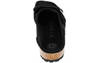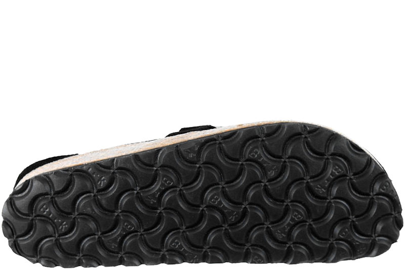 Super fin slippers fra Birkenstock til damer. Skoen er lavet i sort ruskind med moccasin syninger. Over forfoden har skoen et spænde i sølv, som giver skoen en fin detalje. Indvendigt er skoen foret med ruskind, i samme farve som skoens ydre. Denne model har ligesom mange andre af Birkenstocks modeller en mellemsål i kork. Birkenstock sko er anatomisk opbygget og giver foden den optimale støtte. Birkenstocks særlige udformning aflaster kroppen og fordeler belastningen rigtigt - derfor går du altid godt i et par Birkenstock. Slidsålen er i brunt EVA.