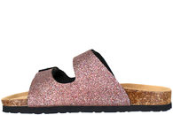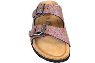Smart slenters fra Cruz. Modellen hedder Winsy og har to remme henover foden. Sandalen er lavet i rosa glimmer, som giver et smart look. Sandalen er med to metal-look spænder, en på hver rem, som du selv kan justere efter eget behov. Dæksålen er lavet i ruskind og er super blød, mellemsålen i kork og slidsålen i sort EVA.