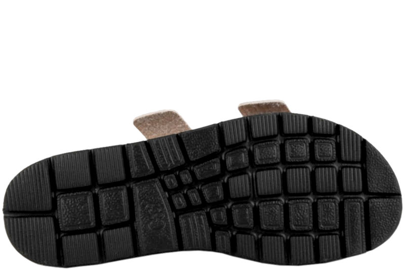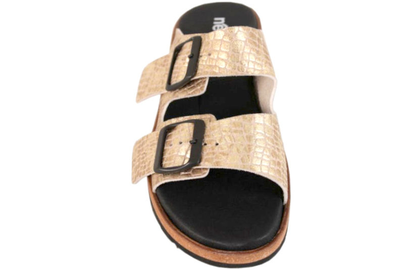 Guld slenters på en super let sål med shine. Den er med to brede regulerbare remme over foden, med metalspænder på. Indlægsålen er sort og er 6 mm. tyk. Sålen giver en utrolig god støtte, er stødabsorberende og blød. Denne model har ekstra støtte i svangen. Indlægssålen sidder fast med velcro. Sålen er sort og er lidt højere bagtil. Dette giver en god holdning. Det højeste sted måler 3,1 cm. Mellemsålen er af kork. Slidsålen er en sort gummisål. Sandalen er meget velegnet til gigtramte, diabetiker og følsomme fødder. God sandal med en super god støtte.