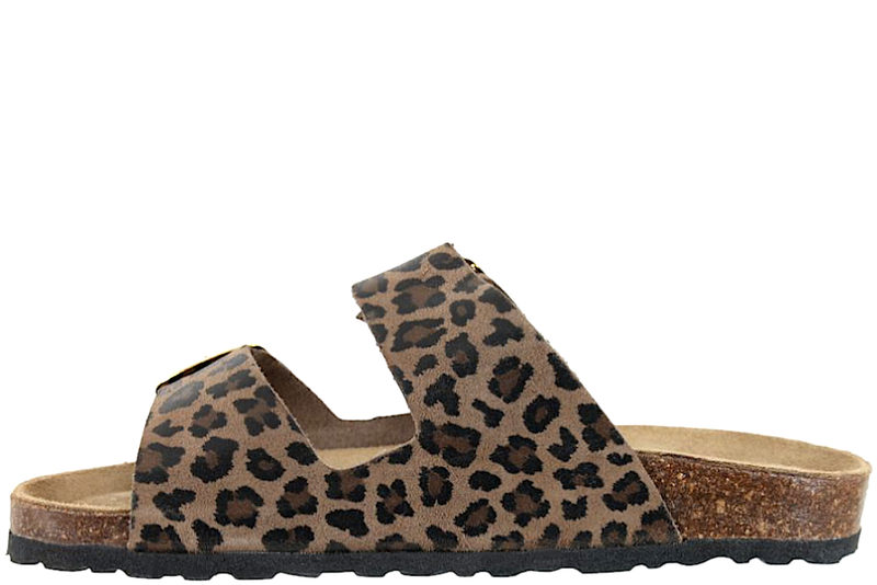 Super smart slenters fra Relaxshoe i skind med leopardprint. Skoen har to remme, en over forfoden og en over vristen. Remmene er med spændelukning, som gør at skoen er nem at justere efter foden. Spænderne er guldfarvede, hvilket giver skoen et rigtig smart look. Indvendigt er skoen foret med brunt skind, som gør skoen blød at have på. Dæksålen er en blød sål, som gør skoen behagelig at have på. Mellemsålen er i kork. Slidsålen er i sort EVA. En rigtig smart slenters, som pifter looket op.
