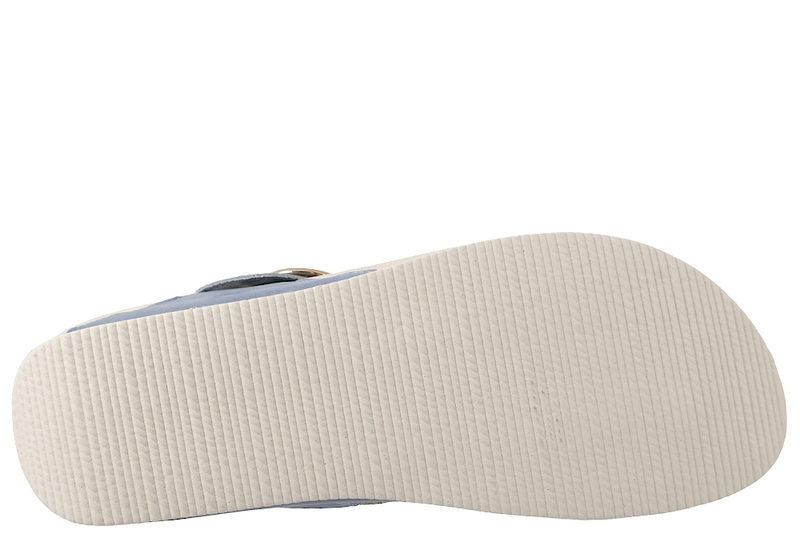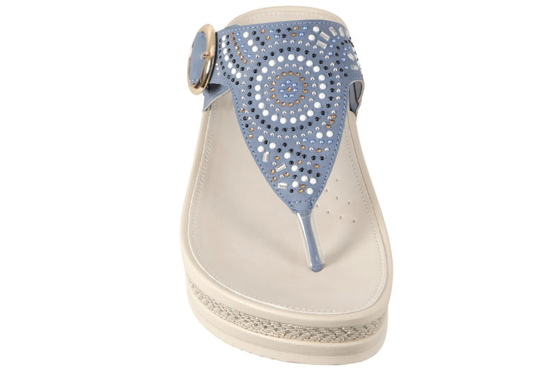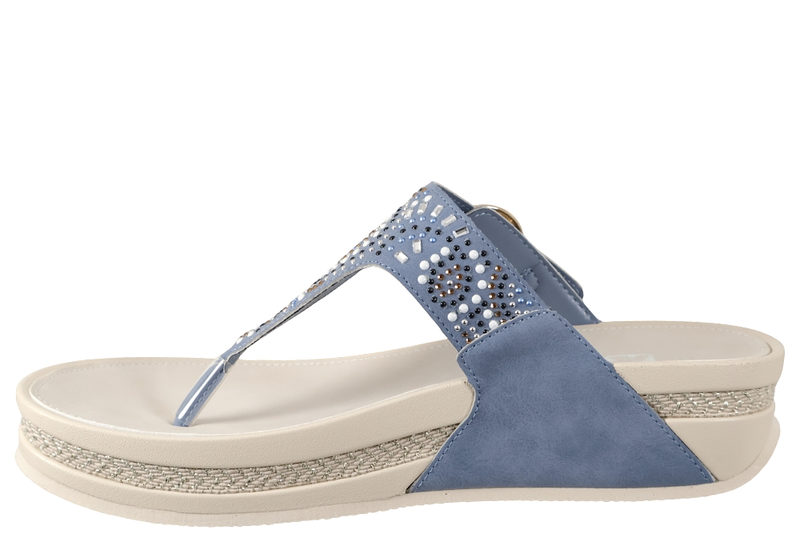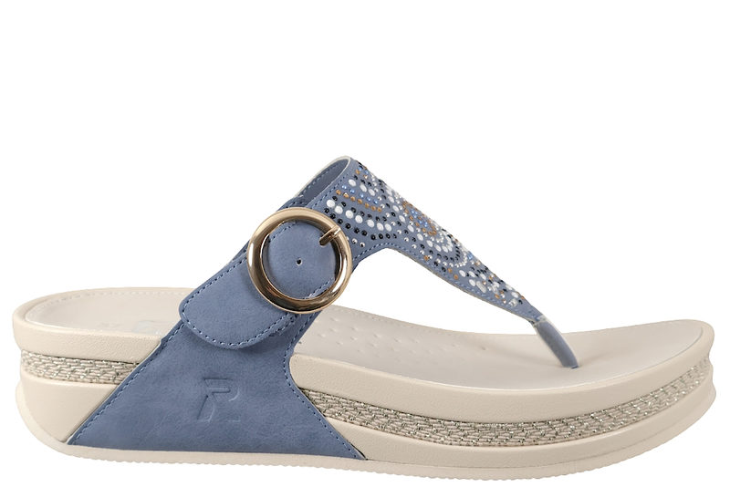 Super smart slenters med tårem til dame fra Rieker. sandalne er lavet i lyseblåt PU. Modellen er med en tårem, og har en rem over forfoden, der kan justeres med en sølv spændelukning. På forbladet er der detaljeret med hvide, guld, sorte og sølv pyntesten i et elegant mønster. Indvendigt er den foret med lyseblåt PU. Dæksålen er af vidt PU. Mellemsålen er i hvidt PVC med en flettet stribe midt på. Slidsålen er en hvid PVC sål. En super smart slenters til dame, der kan bruges til lidt af hvert.