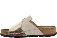 Super smart slenters fra Rohde. Skoen er lavet i beige ruskind samt guldfarvet glat skind. Sandalen har to remme, som krydser over vristen, hvor den ene rem er lavet af beige ruskind og den anden er af guld glat skind. Indvendigt er skoen foret med brunt skind og har en dæksål af ruskind, som er behagelig at træde på. Mellemsålen er lavet af brunt PU. Slidsålen er lavet af sort PU. Super smart slenters, som er behagelig at have på.