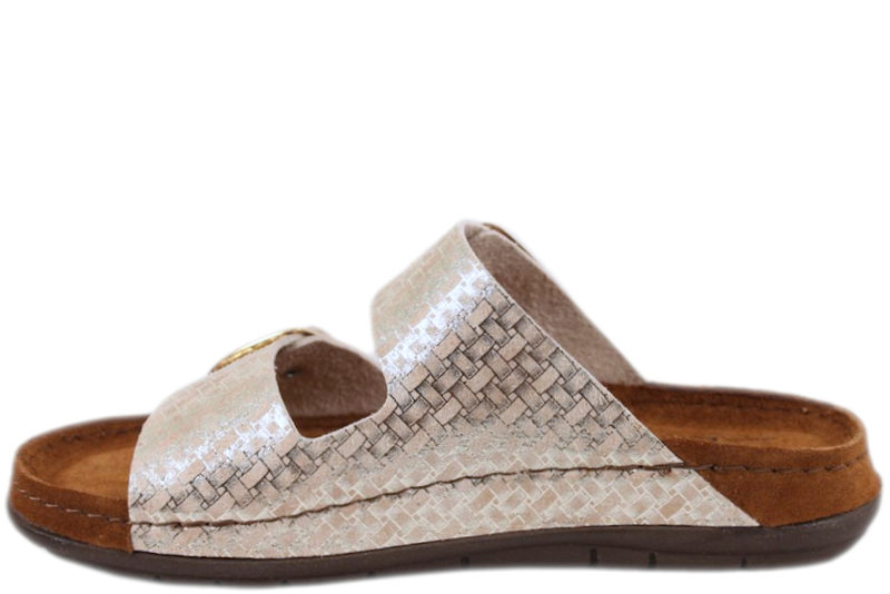 ROHDE. Slenters fra Rohde i guldfarvet møstret kunstskind. Indvendigt er der en super blød ruskindssål, som er behagelig og stødabsorberende. Sandalen har to remme foran, med to metal lukninger i guld. Sandalen har en lille hæl på 3 cm. så den har en god højde. Slidsålen er Eva skum i brun med stødabsorbering i hælen. På ydersiden står der Rohde med sort skrift.