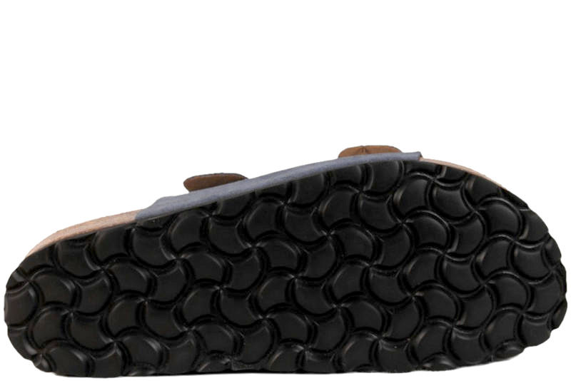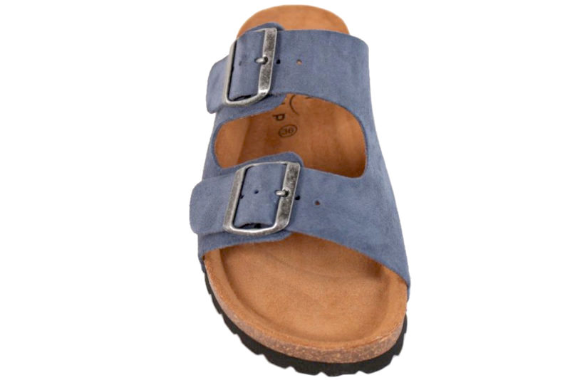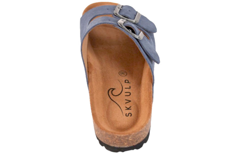 Super smart blå slenters i ruskind fra Skvulp. Modellen er med to brede remme over foden. På remmene er der to metalspænder, så den kan reguleres helt perfekt til din fod. Dæksålen er lavet i naturfarvet ruskind, der er blødt at gå på. Dæksålen er anatomisk opbygget og giver foden den optimale støtte. Mellemsålen er lavet af kork og slidsålen af sort EVA. Rigtig god slenters, der både er smart og komfortabel.