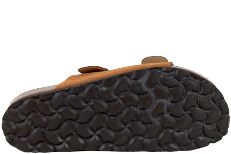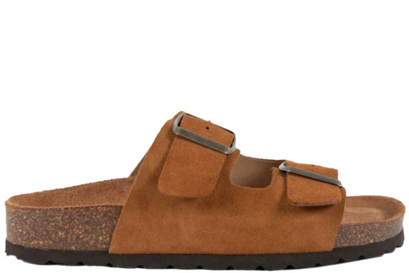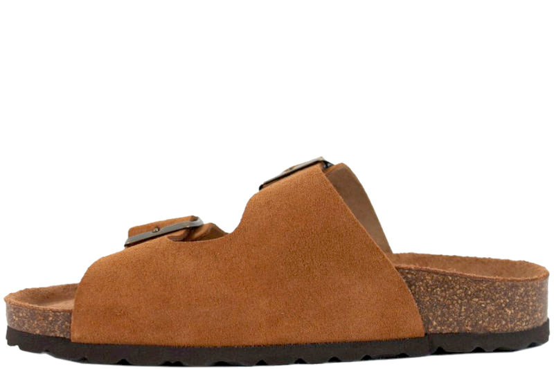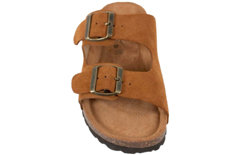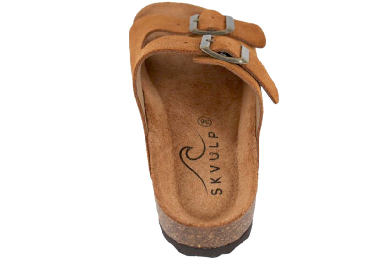 Super smart brun slenters i ruskind fra Skvulp. Modellen er med to brede remme over foden. På remmene er der to messingspænder, så den kan reguleres helt perfekt til din fod. Dæksålen er lavet i naturfarvet ruskind, der er blødt at gå på. Dæksålen er anatomisk opbygget og giver foden den optimale støtte. Mellemsålen er lavet af kork og slidsålen af brunt EVA. Rigtig god slenters, der både er smart og komfortabel.