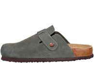 Super smart slenters med lukket tå. Den er lavet i olivengrønt ruskind. På ydersiden er der et spænde, som giver et smart look. Indvendigt er den foret med ruskind og har en blød dæksål i ruskind og med pude i hælen. Mellemsålen er af kork. Slidsålen er en brun PVC sål. God slenters, lige til at smutte i.