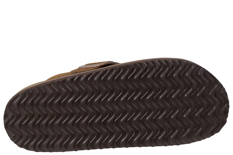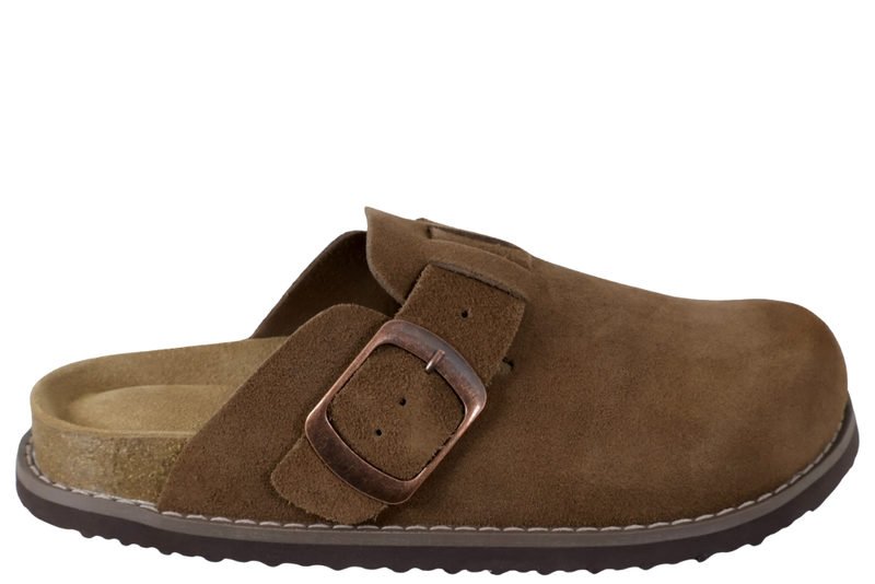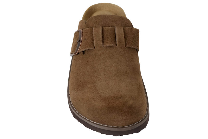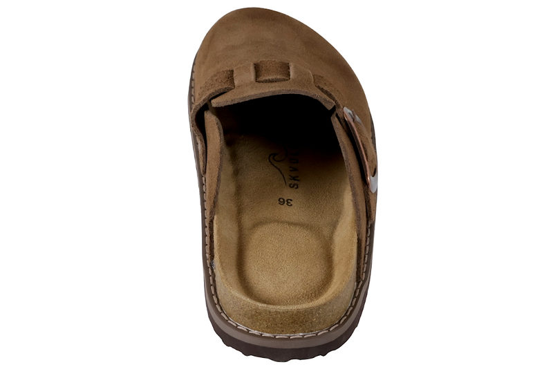Super smarts slenters med lukkede snude til damer. Den er lavet af skind i en flot mørkebrun ruskind. Henover vristen er der en rem, der kan justres med et spænde. Indvendig er den foret med brunt skind og har en blød skind dæksål. Mellemsålen er af kork. Slidsålen er en brun PVC sål.