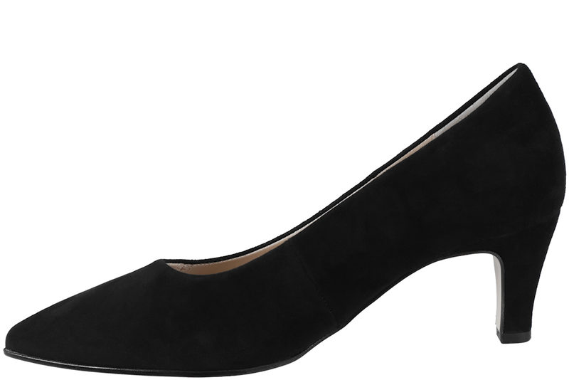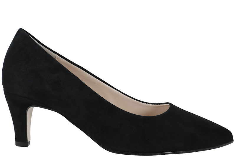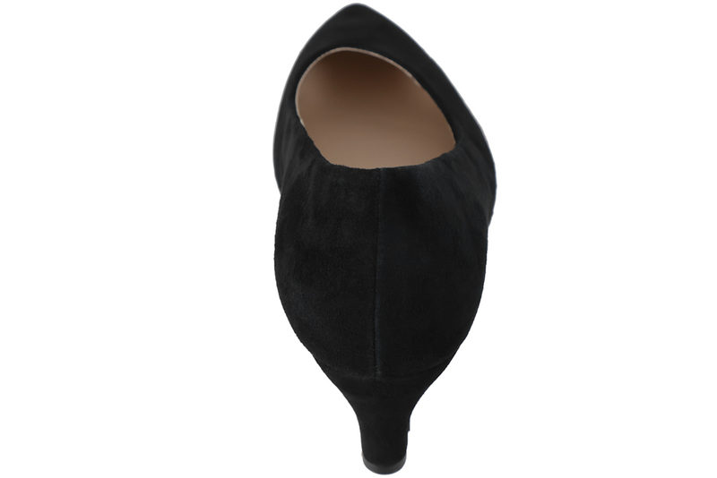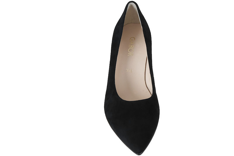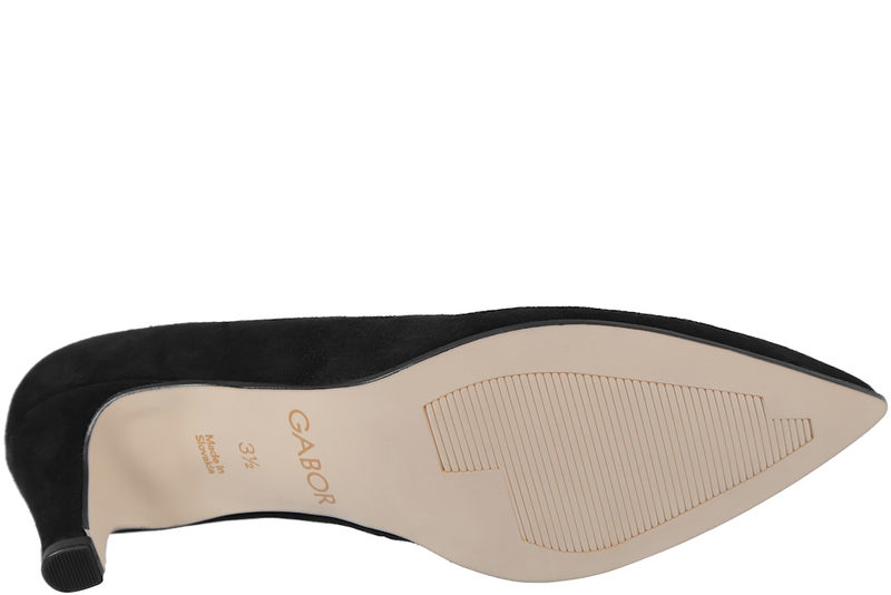 Super fin stilet fra Gabor til damer. Skoen er lavet af sort ruskind. Den er med spids snude, som giver et elegant look. Indvendigt er den foret med lyst glat skind, og den har en skind dæksål. Slidsålen er en lys PVC sål. Hælen måler 5,5 cm.