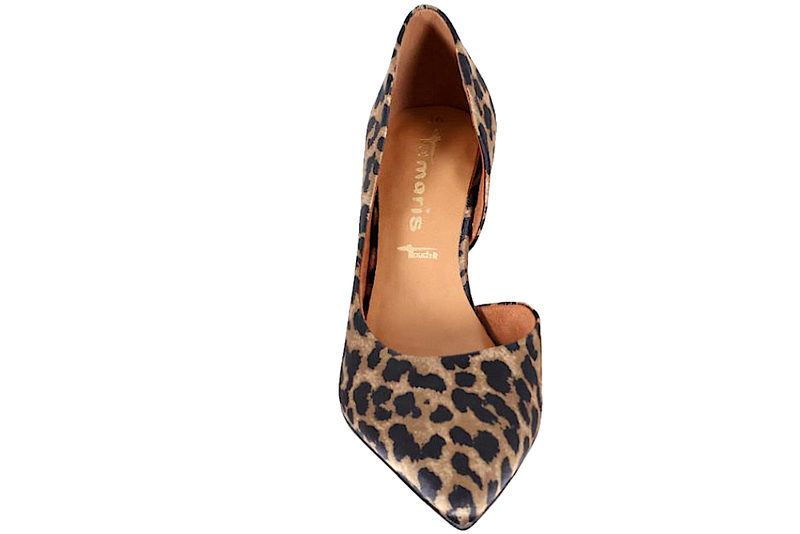 Smart stilet fra Tamaris. Den er lavet af tekstil med leopard look. Den har en spids snude. Indvendigt er den foret med brunt tekstil og har en brun Touch It dæksål i skind. Slidsålen er en sort PU sål. Hælen måler 6 cm.