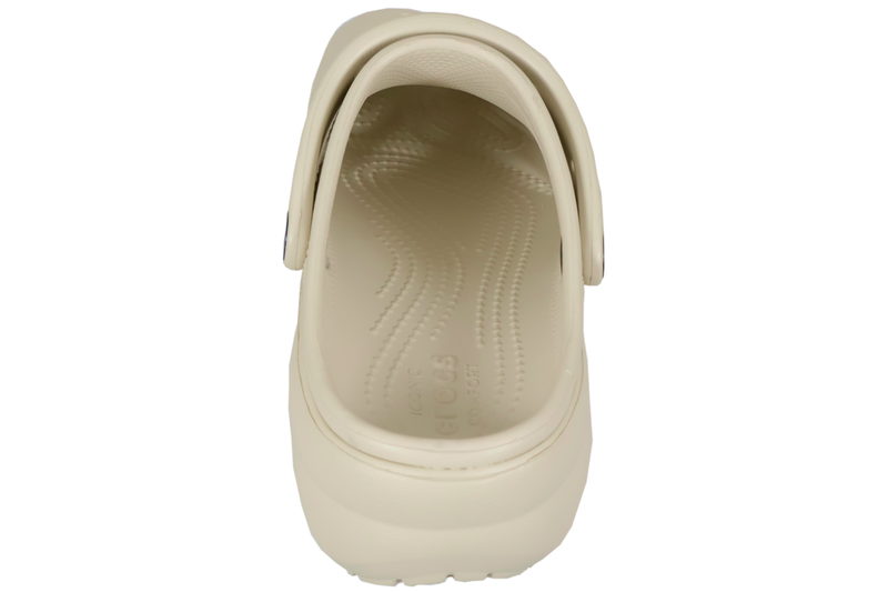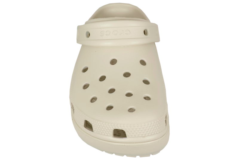 Beige farvet clogs i gummi fra Crocs med plateau. De er super lette og luftige med huller over forfoden. Remmen kan bruges både over vristen og omkring hælen. Skoen er antibakterielle. De er super nemme at komme i og skønne at bruge. Tåler vand.