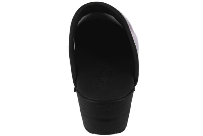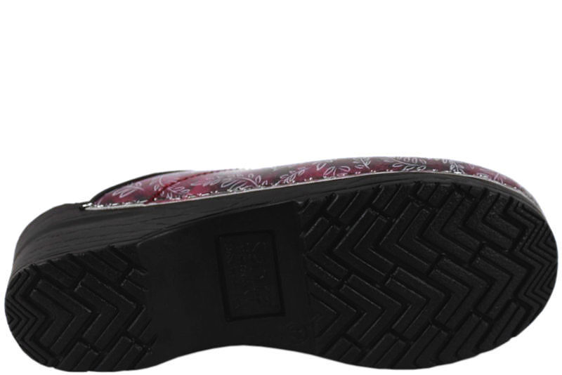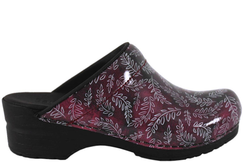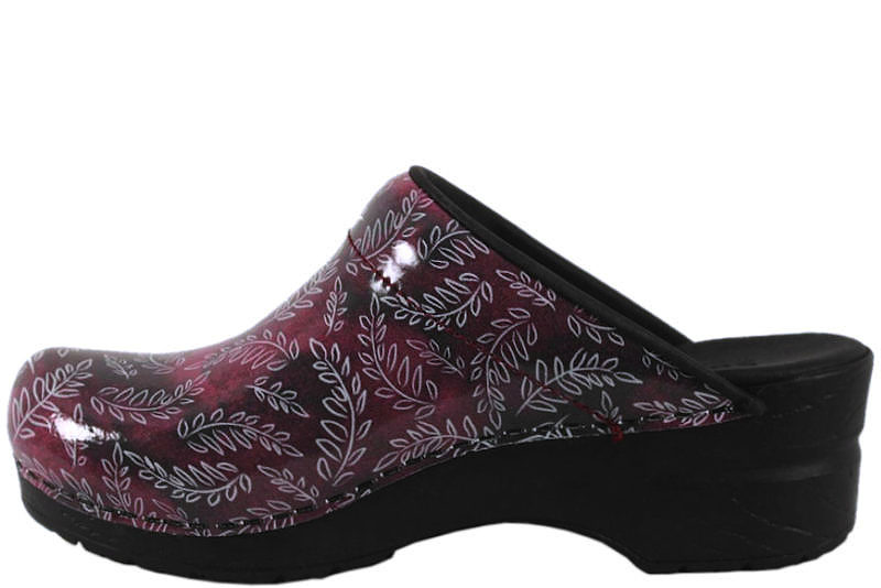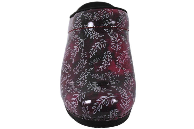 Smart tøffel træsko i lak med plantemønster i bordeaux nuancer på en let bøjelig gummisål. Indvendigt er den sort og har en sort dæksål i læder. Rigtig god kvalitets træsko, som er lidt sjovere end de almindelige sorte.