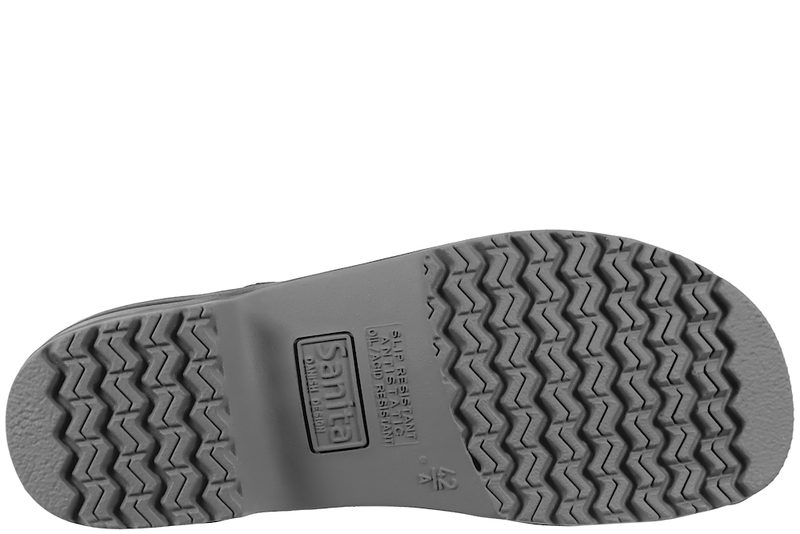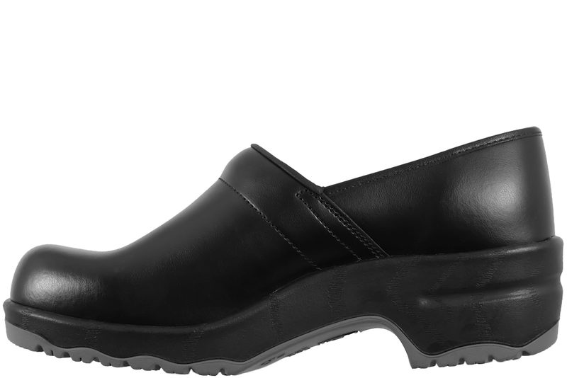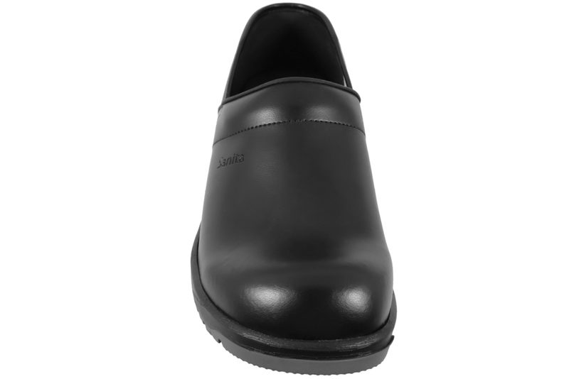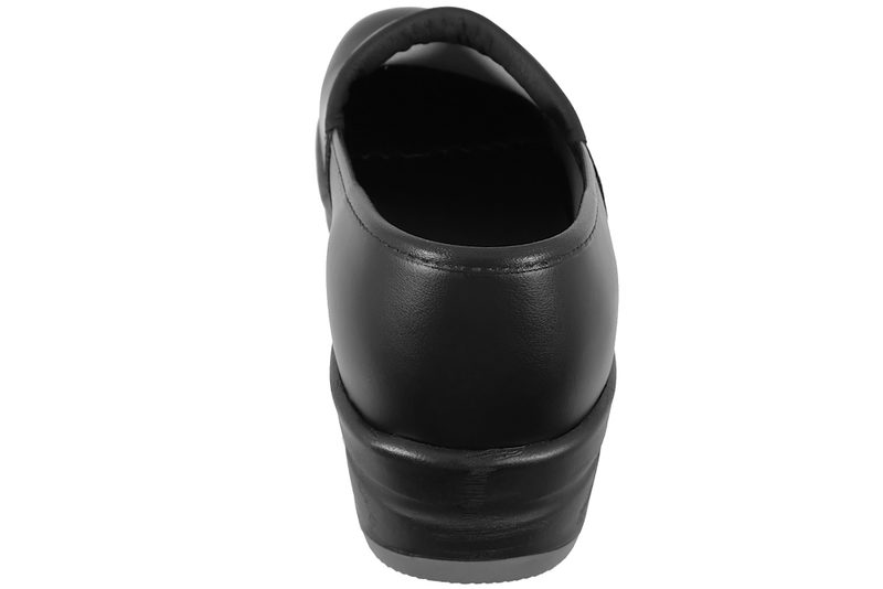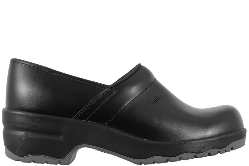 Sanita gummitræsko til dame. Sålen er lavet ekstra skridsikker og antistatisk. Overdelen er lavet i sort kraftigt skind. Modellen er med hælkappe.