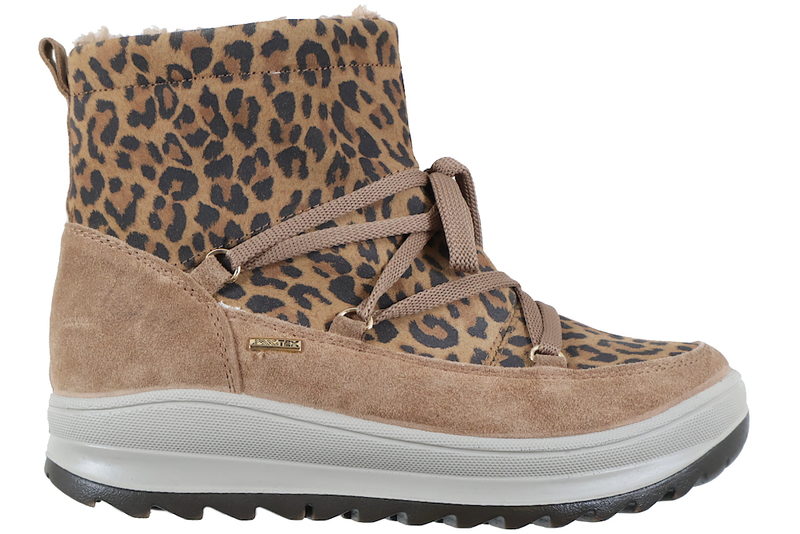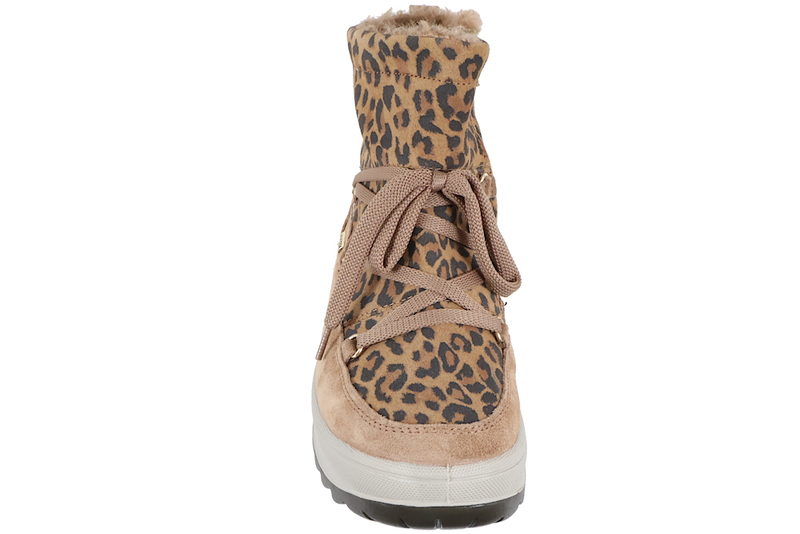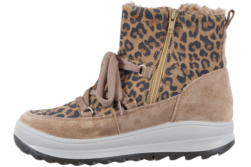 Super smart vinterstøvle fra Imac til dame. Støvlen er lavet af brunt ruskind sasmt ruskind med leopardprint. Op langs støvlen er der brune snørrebånd, så den kan tilpasses efter foden. På indersiden af støvlen er der en lynlås, så den er let af komme i og få af. Indvendigt er støvlen foret med brunt og hvidt foer. Indlægssålen er lavet af hvidt filt. Mellemsålen er grå og lavet af EVA. Slidsålen er af sort gummi. Denne model er med ImacTEX, så den holder fødderne tørre. En super smart og praktisk vinterstøvle til dame.