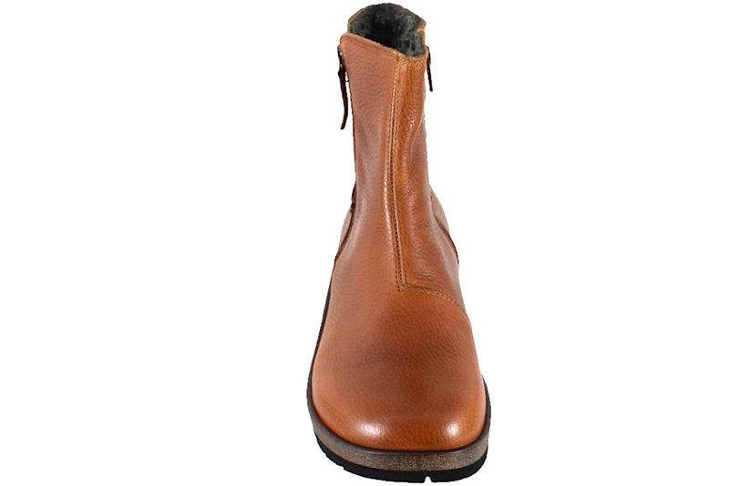 Brun støvle i præget kalveskind. Støvlen er med lynlås på ydersiden, så den er let at komme i og af. Dæksålen er som altid deres super behagelige 6 mm sål, som er utroligt lækre at gå på. Selve slidsålen er sort, let og har et godt mønster, så man står godt fast. Støvlen er god til diabetikere, gigtpatienter, og generelt folk med følsomme fødder. Det er de på grund af deres lækre såler. Der er ikke nogle generende indvendige syninger, der kan provokere fødderne. Så er der god plads til fødderne, hvilket er vigtigt for alle fødder. Indvendigt er støvlen foret med gråt foer, så den er dejlig varm til de kolde dage. Støvlen er med tex. Super god støvle.