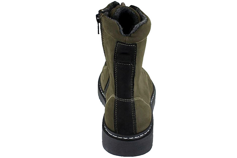 Super god støvle fra New Feet til damer. Støvlen er lavet af olieret nubuck i en flot mørkegrøn farve. Foran er der matchende snørebånd, så den kan snøres ind til foden og benet. På indersiden er der en lynlås, så den er let at komme i og af. Indvendig er den foret med gråt lunt foer. Der er den velkendte 6mm indlægssål, som skåner knæ og ryg. Der er ingen indvendige syninger. Støvlen er super god til folk med diabetes eller gigt. Slidsålen er en sort gummisål.