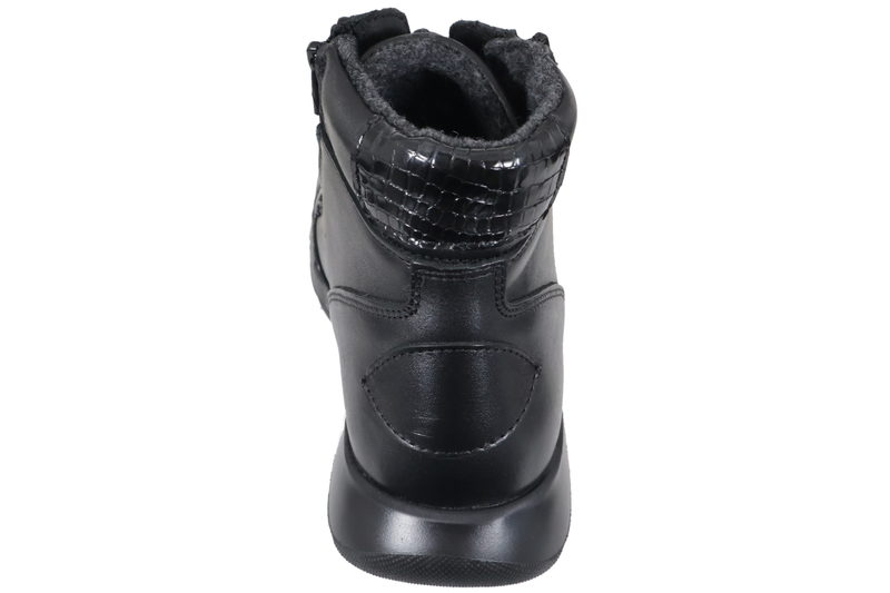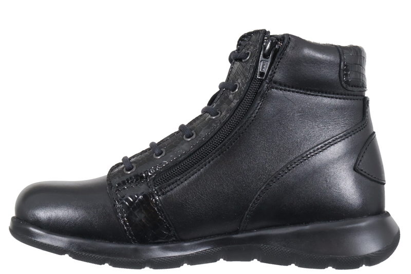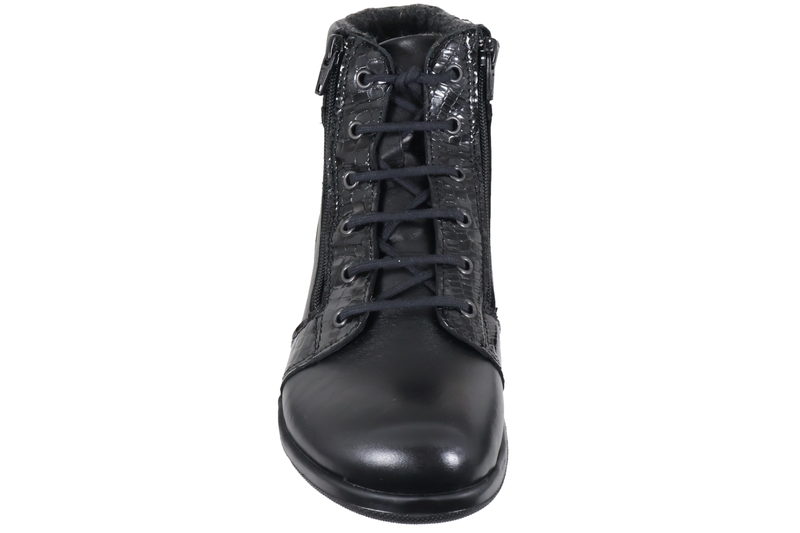 Virkelig smart vinterstøvle fra NewFeet til dame. Vinterstøvlen er lavet af sort glatskind. Op langs støvlen er der sorte snørebånd, så den kan tilpasses efter foden. Støvlen er detaljeret med læder der er præget med at slangeskindslook. Støvlen har to lynlåse, så den er nem at komme af og i. Indvendigt er skoen foret med gråmeleret for. Støvlens indlægssål er 6mm. Sålen er lavet af sort EVA. En virkelig smart vinterstøvle til de kolde dage.
