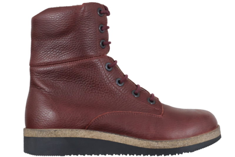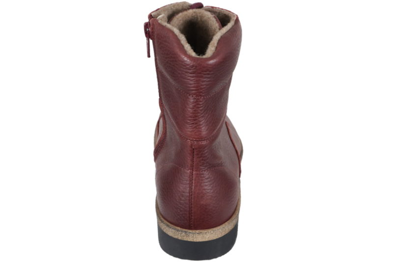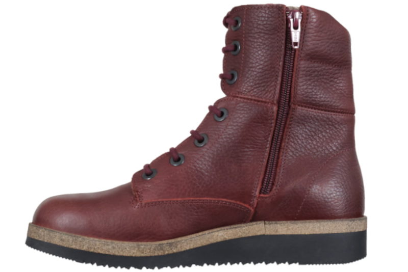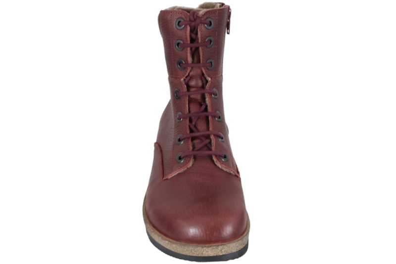 Mørkerød støvle i glat læder. Støvlen har røde snørebånd, så den let kan reguleres ind til foden og en lynlås på indersiden, så den er let at komme i og af. Dæksålen er som altid deres super behagelige 6 mm. sål, som er utroligt lækker at gå på. Selve slidsålen er sort, let og har et godt mønster, så man står godt fast. Støvlen er god til diabetikere, gigtpatienter, og generelt folk med følsomme fødder, det er de på grund af deres lækre såler. Der er ikke nogle generende indvendige syninger, der kan provokere fødderne. Så er der god plads til fødderne, hvilket er vigtigt for alle fødder.