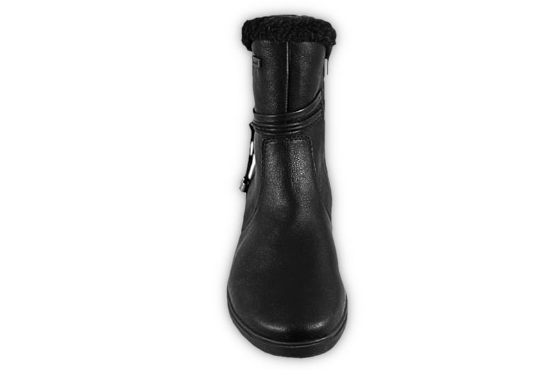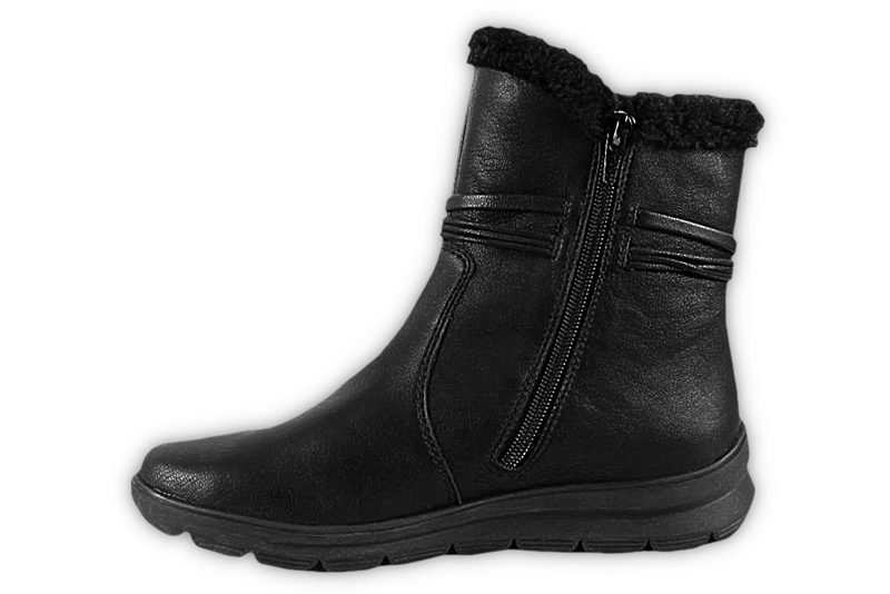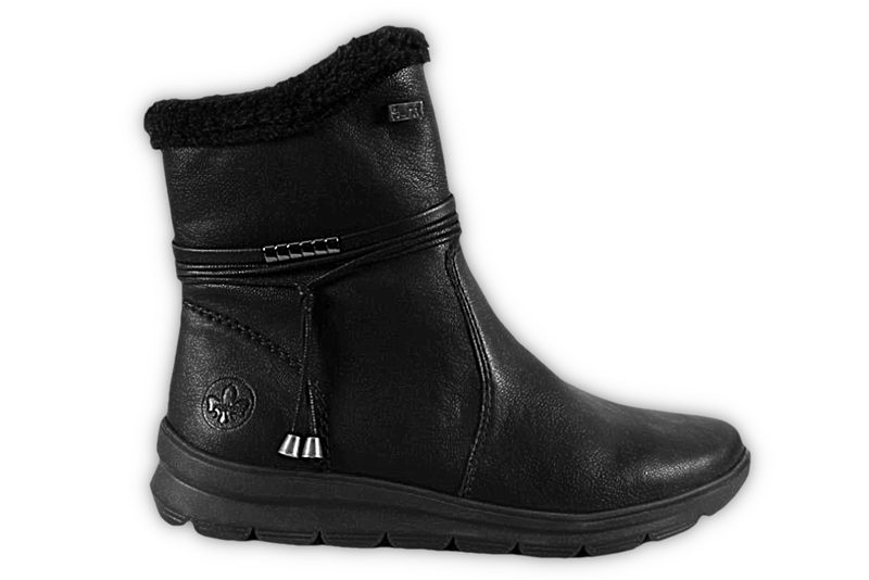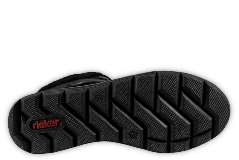 Vinterstøvle med skaft fra Rieker til damer. Støvlen er lavet af sort PU. På indersiden af støvlen er der en lynlås, så den er let at komme i og af. Rundt om skaftet er der nogle fine pyntesnorer, som giver støvlen en fin detalje. Støvlen er med riekerTEX, som gør den er vandtæt. Indvendigt er den foret med sort foer, og har en sort tekstil dæksål. Slidsålen er en grov sort gummisål med god stødabsorbering.