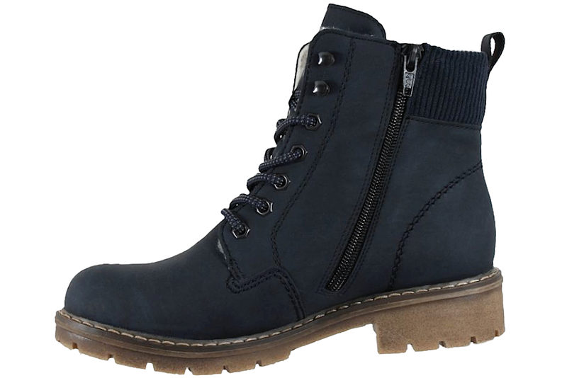 Blå vinterstøvle med hvidt plysfor fra Rieker. Støvlerne er lavet i PU, og har et lille spænde i mørk sølv på ydersiden. Støvlen er med snørebånd, og har en lynlås på indersiden, så man nemt og hurtigt kan få den på og af. De er med Rieker Tex, som gør støvlerne vandtætte. Slidsålen er en profileret gummisål, som har et godt vejrgreb. Super praktisk vinterstøvle fra Rieker.