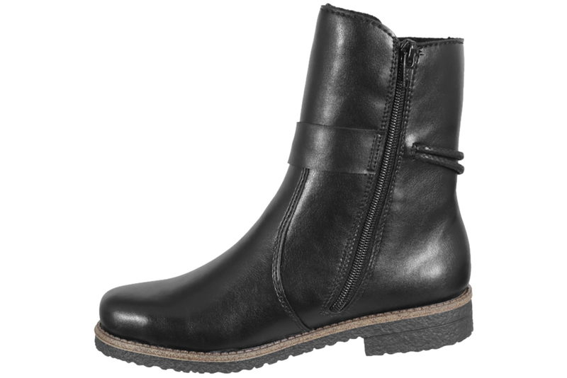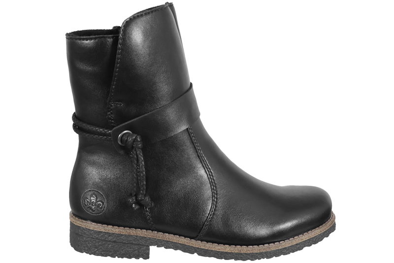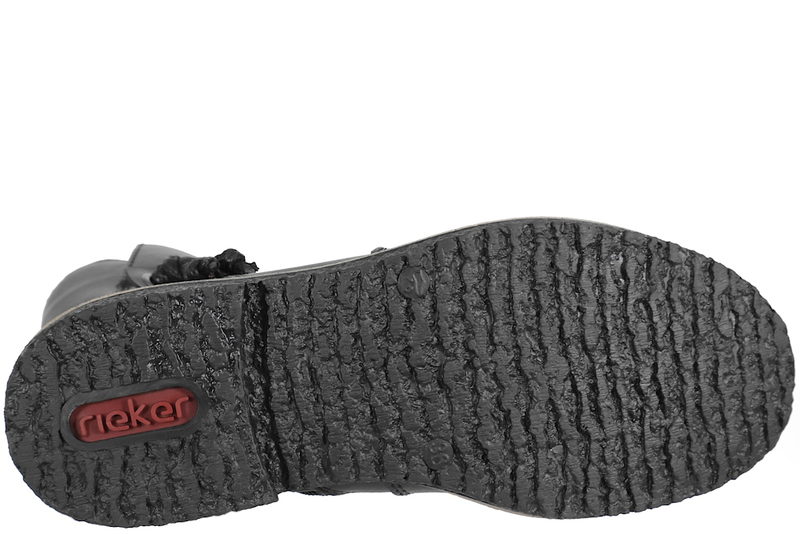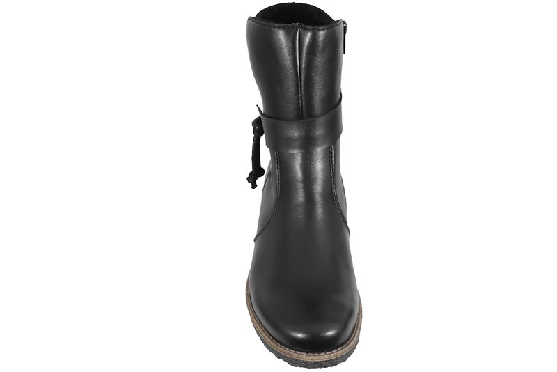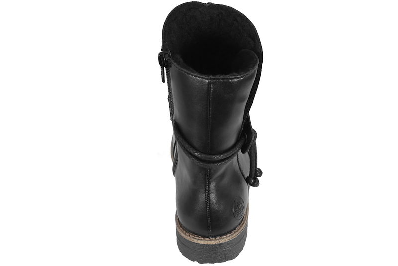 Flot vinterstøvle fra Rieker til dame. Støvlen er lavet af sort PU. Rundt langs skaftet er der en rem med sort snøre, som giver et smart look. På indersiden er der en lynlås, så den er let at komme i og af. Indvendigt er den foret med tykt sort foer, og den har en foret indlægssål. Slidsålen er en sort gummisål.