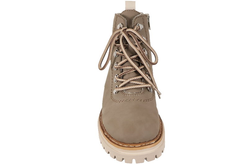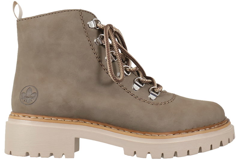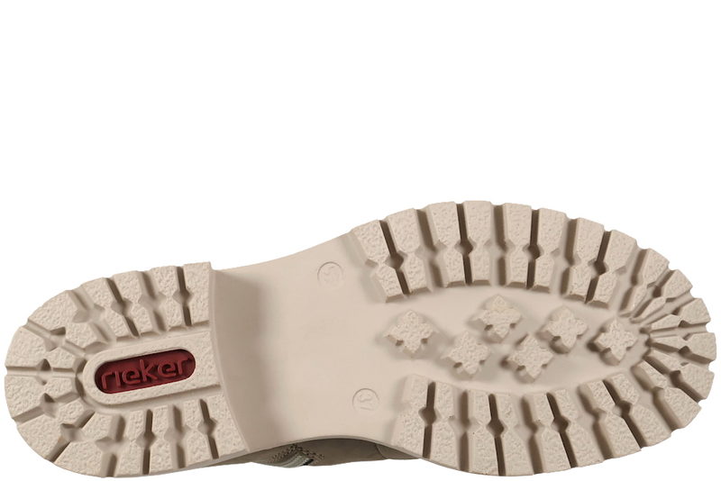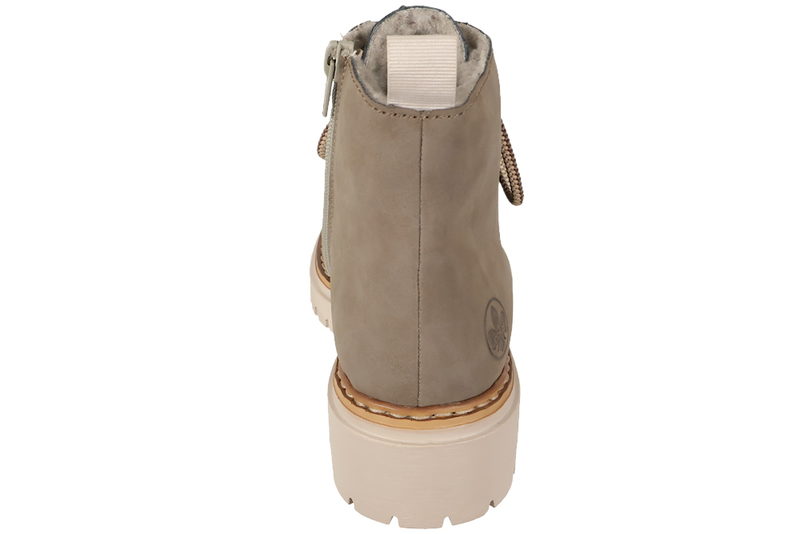 Super god vinterstøvle fra Rieker til damer. Støvlen er lavet af lysebrunt alcantara. Foran er der snørebånd, så den kan tilpasses efter foden. Indvendigt er den foret med lunt beige foer, så fødderne holdes lune. På indersiden er der en lynlås, så den er let at komme i og få af. Slidsålen er en beige gummisål med mønster, så man står fast. Rigtig god og varm vinterstøvle.
