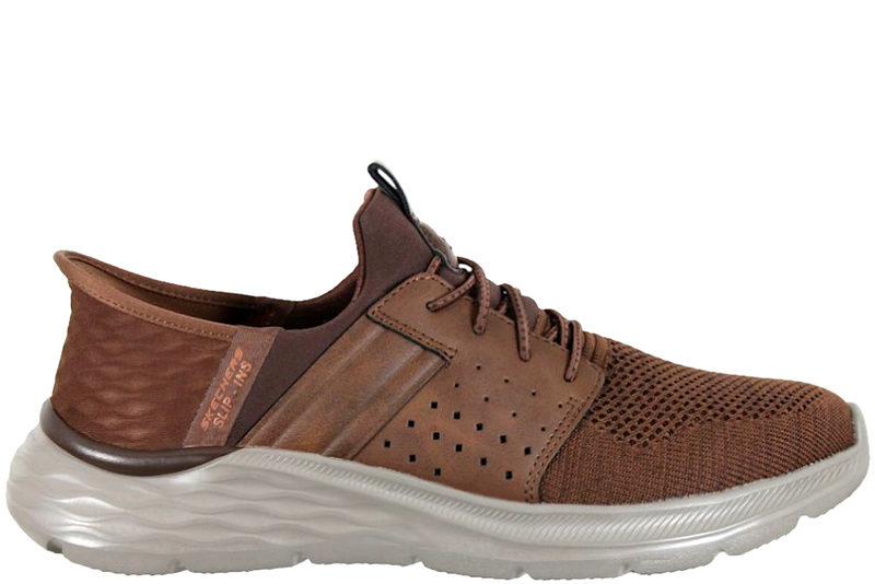Super smart slip-ins sneakers fra Skechers til mænd. Skoen er lavet i brunt tekstil og mesh. Op langs vristen har skoen brune elastik snørebånd, som giver et smart look. Indvendigt er skoen foret med brunt tekstil, og har den velkendte Air-Cooled Memory Foam sål, med svangstøtte. Slidsålen er lavet af lysebrunt EVA. Skoen har en fast hælkappe, samt en forsejling i hælkappen, der gør man kan komme i skoen uden brug af skohorn. Modellen bliver også kaldt "SLIP-INS" eller "Hands-Free". Super god sko til både hverdag og fritid.