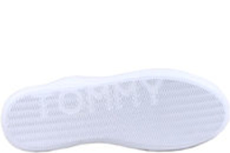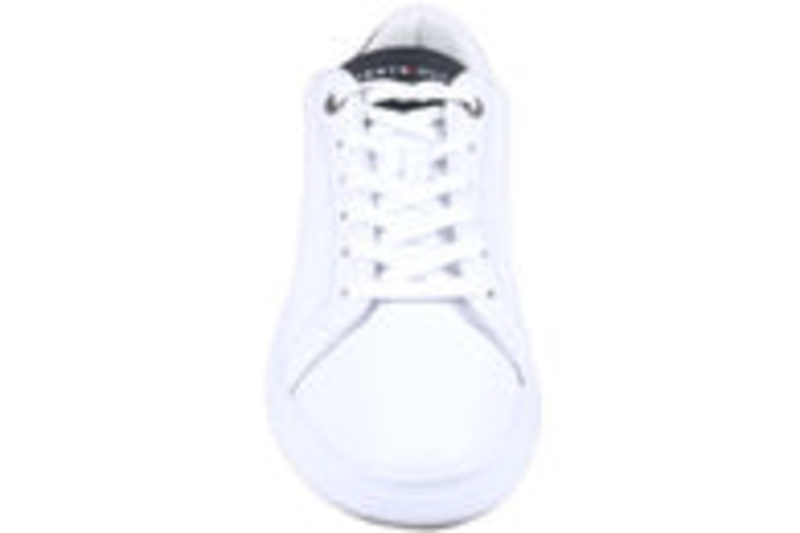 En lækker sneakers i hvid læder og med hvide snørebånd. Hælkappen er i to blå nuancer hvor det hvide og blå logo også er på. Pløsen er mørkeblå og hvid, hvor der er trykt "TOMMY HILFIGER". Indvendigt er den foret med hvid tekstil og en marine farvet dæksål. Slidsålen er en hvid slidstærk gummisål. Smart sko som kan bruges til lidt af hvert.