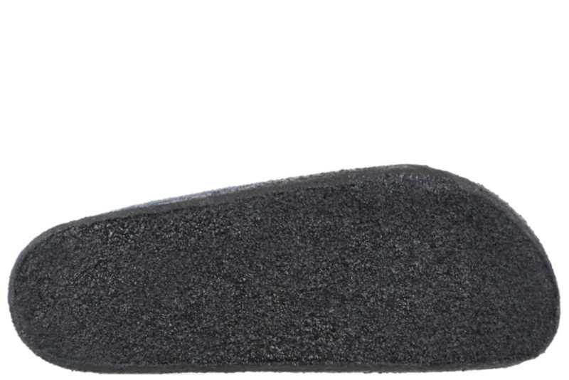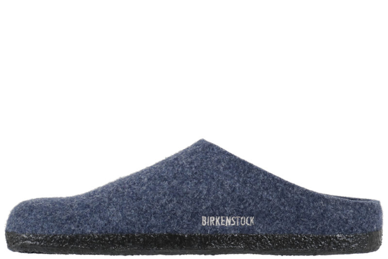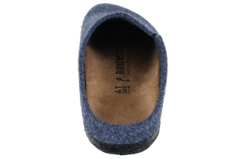 Super god hjemmesko fra Birkenstock. Hjemmeskoen er lavet af blåt uldfilt, så fødderne holdes lune. På ydresiden er der en lille nitte, hvorpå det står "BIRKENSTOCK TRADITION SINCE 1774". Indvendigt er den foret med uldfilt og har den velkendte sål af kork og ruskind, som er udtagelig. Slidsålen er lavet af mørkegråt latex. Dette er den smalle model.