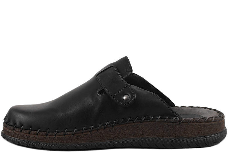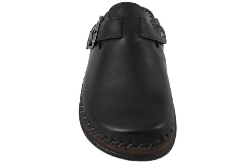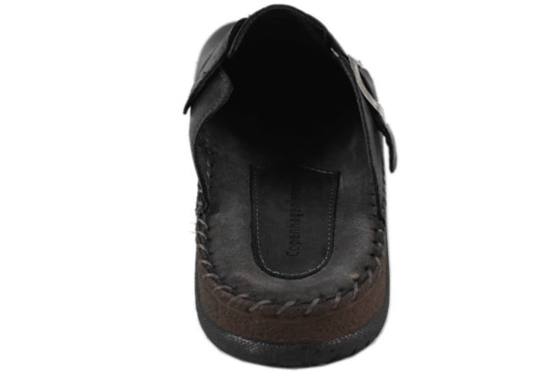 Super fin hjemmesko til mænd. Overdelen er lavet i sort skind. Over vristen er der en rem med et sølv spænde med patina. Indvendigt er den skindforet. Dæksålerne er lavet i blødt tekstil. På dæksålen står der "Copenhagen shoes". Mellemsålen er lavet i mørkebrunt kork. Slidsålen er lavet i sort gummi, så de er slidstærke. Hjemmeskoen er med god stødabsorbering.