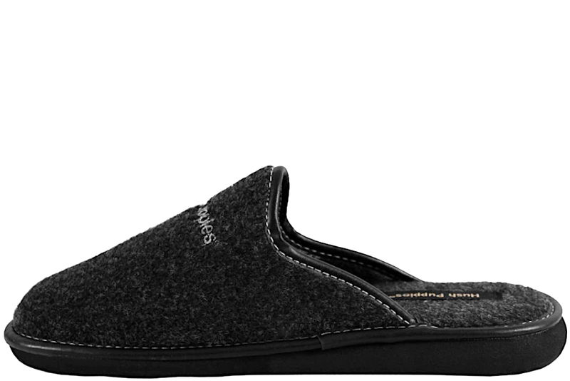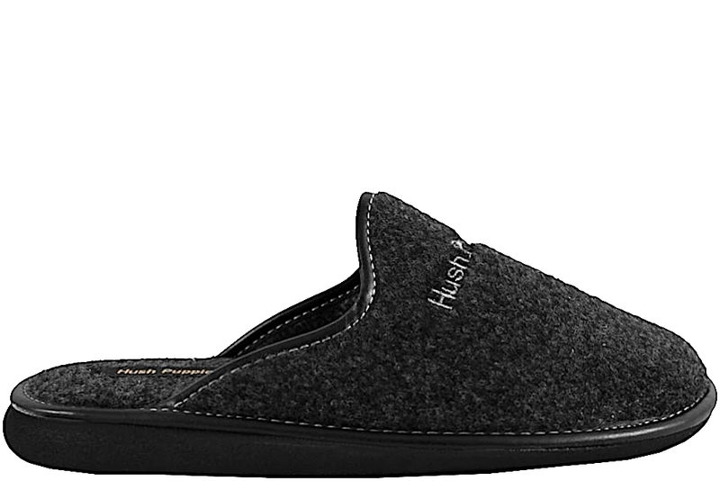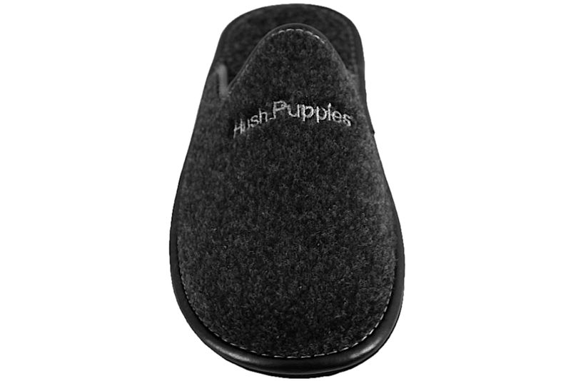 Super fin hjemmesko fra Hush Puppies til herre. Hjemmeskoen er lavet af mørkegrå filt. Foran står der "Hush Puppies" med lysegrå tråd. Indvendigt er den foret med grå filt. Slidsålen er en blød og let EVA sål. Rigtig let og varm hjemmesko, der er lige til at smutte i.