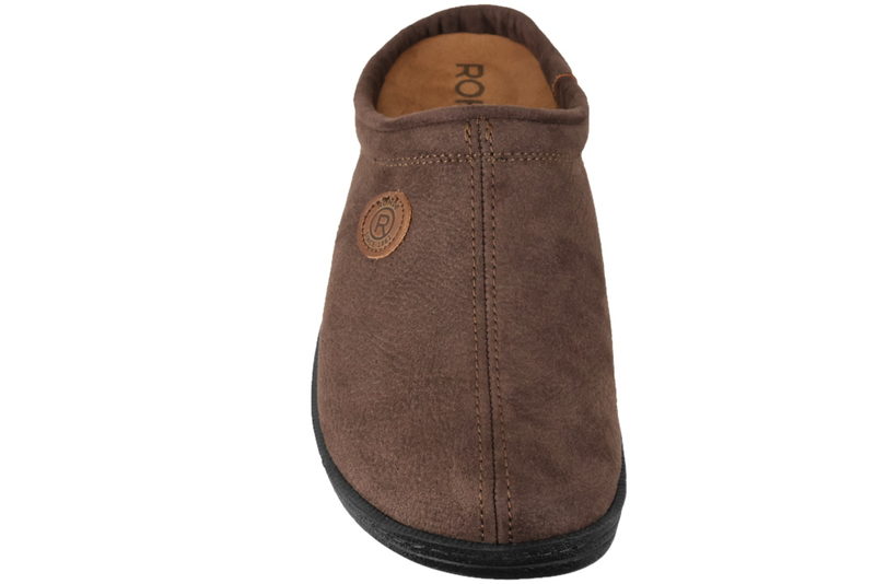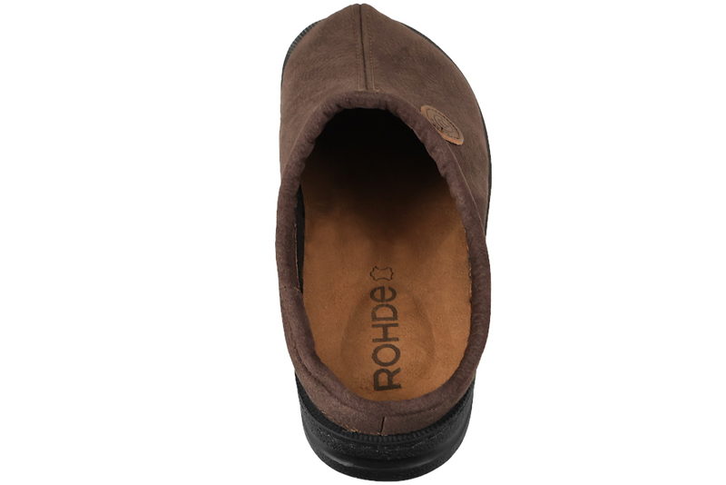 Dejlig varm hjemmesko fra Rohde til herre. Skoen er lavet af tekstil i farven mokka. Foran er der et Rohde logo, der giver en smart detalje. Indvendigt er den foret med sort foer, der holder fødderne dejlig varme. Slidsålen er lavet i sort EVA-skum. God til de kolde måneder.