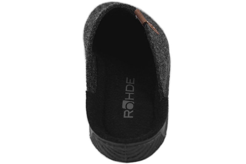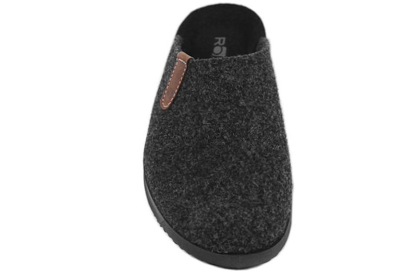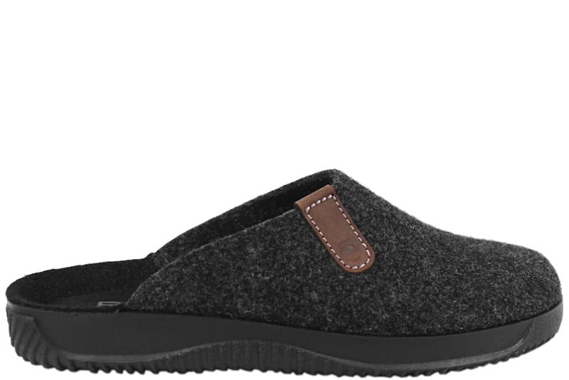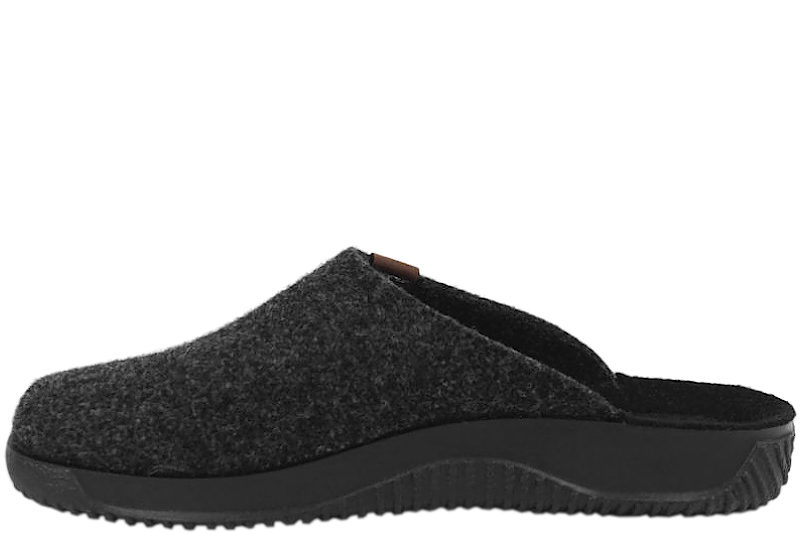 Hjemmeskoen er lavet i mørkegråt filt og har en sort gummisål. Hjemmeskoen er uden hælkappe, så den er nem at komme i og af. Skoen er kileformet, så tøflen har en utrolig god pasform. Der er en skindlap på hælkappen samt på ydersiden af hjemmeskoen. Slidsålen er en sort gummisål.