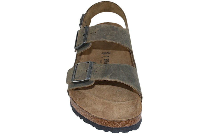 Super smart sandal fra Birkenstock til herre. Sandalen er lavet af olieret skind i farven khaki. Foran er der to remme, som kan justeres med et spænde, så den sidder godt ind til foden. Bagpå på er der en hælrem, som kan justeres med et spænde. Indvendigt er den foret med ruskind og har en dæksål, med svangstøtte, i ruskind. Slidsålen er en sort EVA sål.