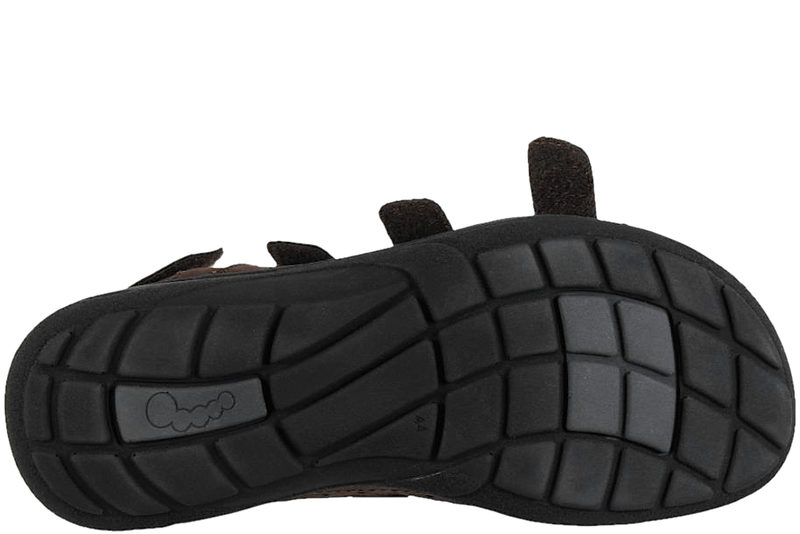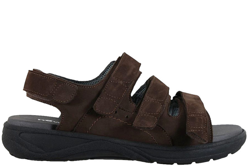 Herresandal i brunt oilskind med 3 velcroremme over foden, samt én omkring hælen. Sandalen har en udtagelig dæksål, hvis man har behov for at få sit eget indlæg i. Super god komfort, meget stødabsorberende og ingen indvendige syninger. New Feet er gode til folk, som har problemer med fødderne, såsom gigt, diabetes eller sårpatienter.