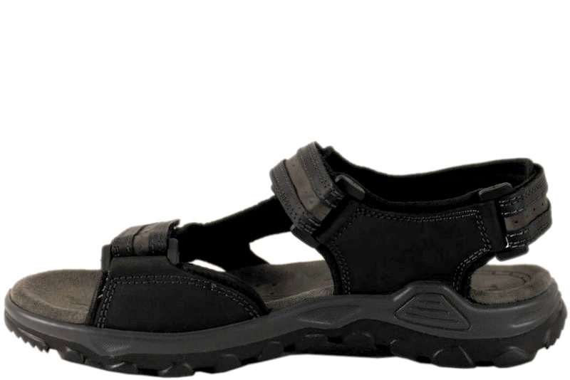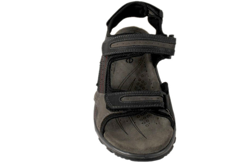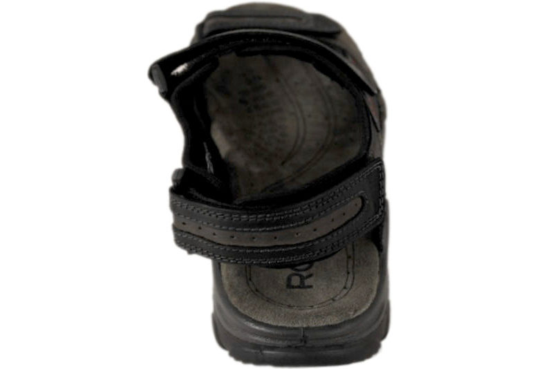 Super god sandal til herre fra Rohde. Sandalen er lavet i sort skind med sort tekstil foer på indersiden. Der er røde og grå syninger rundt på sandalen som giver en fin detalje. Der er tre justerbarer velcroremme, en over forfoden, over vristen og en bagom hælen, så den er let at tilpasse til foden og få til at sidde godt. Dæksålen er utrolig blød og lækker at træde på. Slidsålen er lavet i sort PU, som gør dem super fleksible og slidstærke.