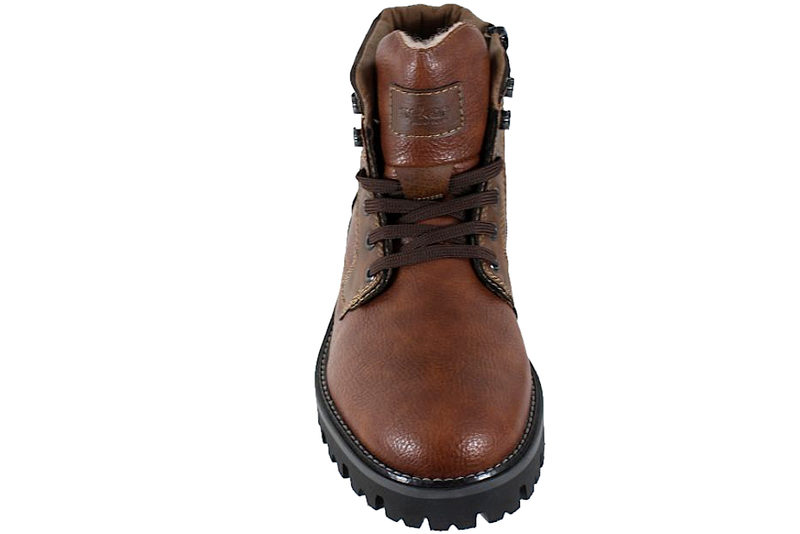 Brun vinterstøvle fra Rieker til herre. Støvlen er med brune snørebånd og lynlås på indersiden. Støvlen er lavet i PU og har mørkebrune detaljer. Indvendigt er den foret med varmt foer. Foret er 100% rent uld. Støvlen er med ekstra vidde, så har man en bred fod er det en dejlig støvle at få foden i, da der er ekstra plads. Slidsålen er profileret og har et godt vejrgreb. Støvlen har en tex-membran, som gør den tåler vand.