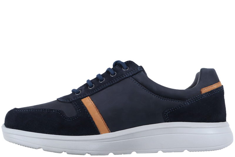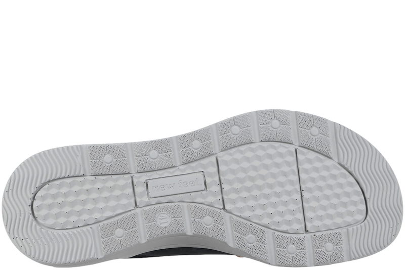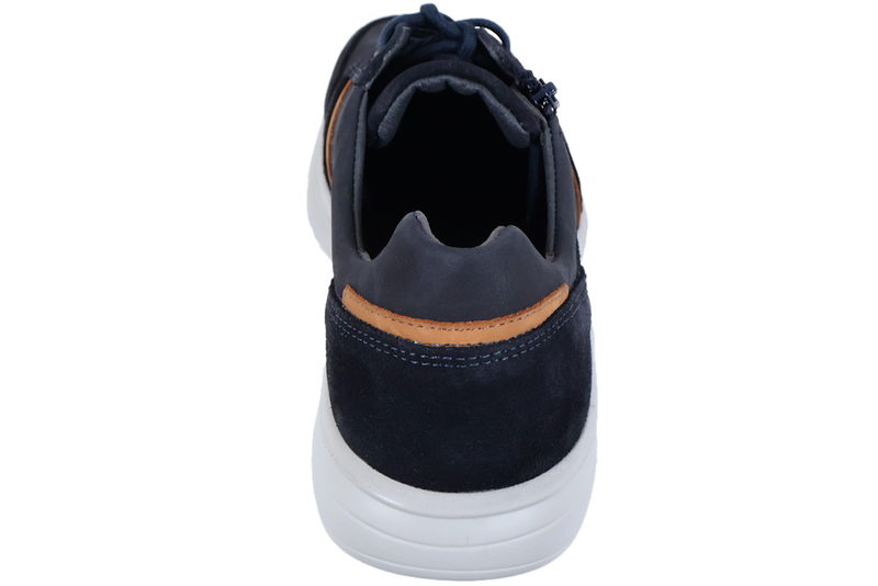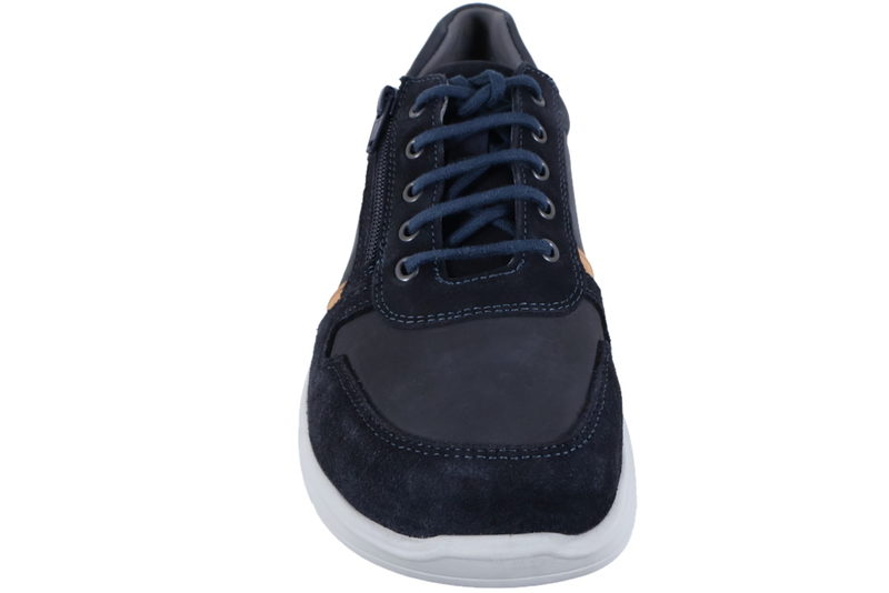 Super flot sko til herre fra New Feet. Skoen er lave af mørkeblå olieret nubuck og ruskind. Rundt på skoen er der brune detaljer. Foran er der blå snørebånd, så den kan tilpasses efter foden. På ydresiden er der en lynlås, så den er let at komme i og af. . Indvendigt er den foret med gråt tekstil. Indlægssålen er den bløde 6 mm. støddæmpende sål, som New Feet er kendt for. Den giver en super god komfort til skoen. New Feet er velenget til personer med gigt og diabetes. Der er ingen indvendige syninger. Slidsålen er en grå PVC sål.