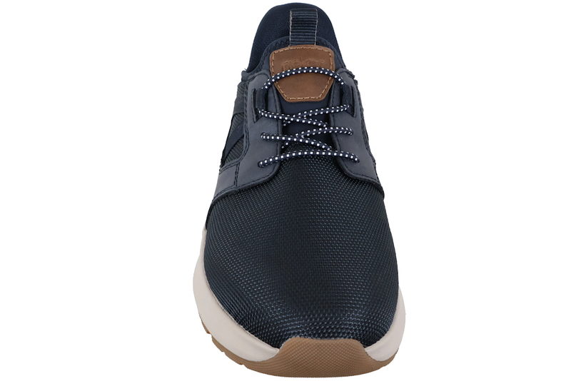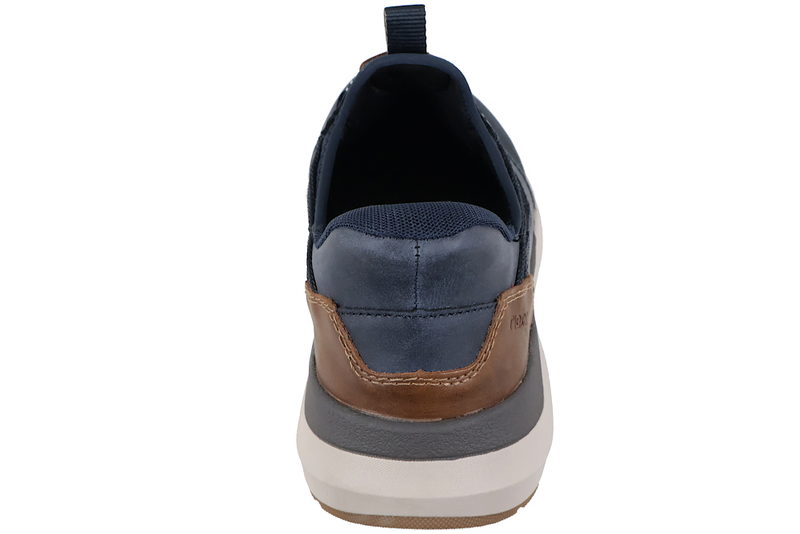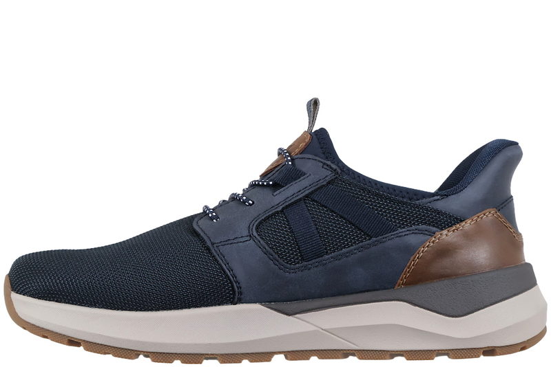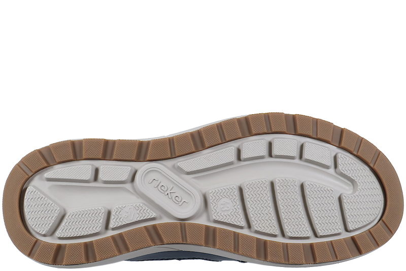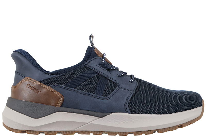 Super fin sko til herre fra Rieker. Skoen er lavet i blå tekstil med blå og brune PU detaljer. Foran er der elastik snørebånd. Indvendig er den foret med blå tekstil og har en grå AntiStress indlægssål. Mellemsålen er en brun EVA sål. Slidsålen er en naturbrun gummisål, så man står fast. Denne model er med Slip In hælkappe, så den er let at komme i og af.