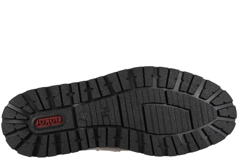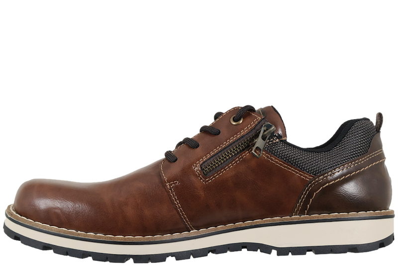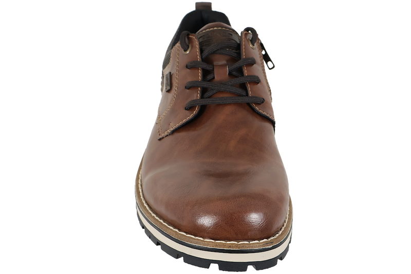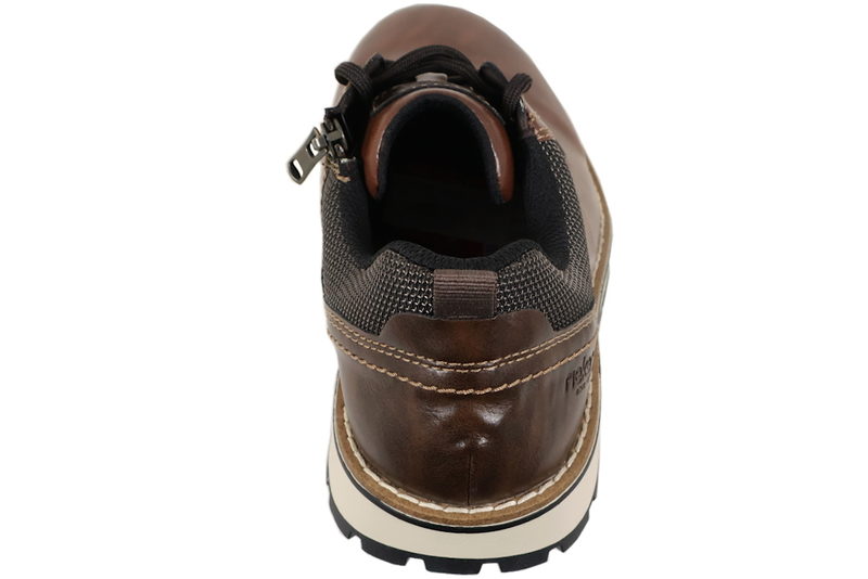 Flot herre sko fra Rieker. Skoen er lavet af brunt kunstskind samt tekstil detaljer. Foran er der brun snørebånd. På indersiden er der en lille lynlås. Indvendig er den foret med sort tekstil og har en skind dæksål. Mellemsålen er af hvid gummi. Slidsålen er en sort gummisål. Skoen er med Rieker-Tex, så fødderne holdes tørre.